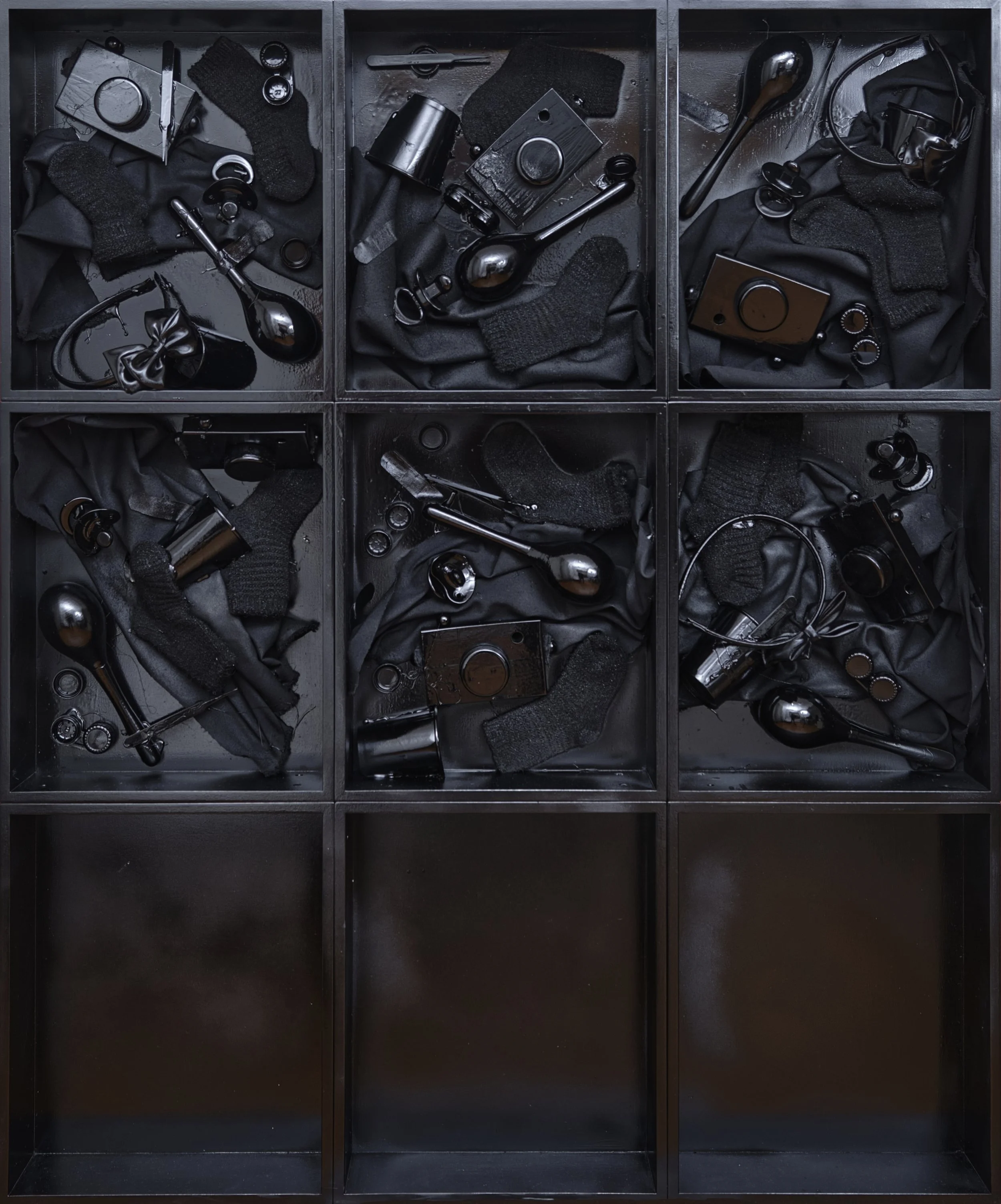 Louise Nevelson’s work, “Mrs. N Palace'' has mesmerized me with its monumental and monochrome usage of the color black, which she achieved by her display of found objects in a monochromatic block presentation. Since I am also a collector of objects representing significant moments in life, I felt a strong connection with this artwork. In this piece, I collected the list of items my mom asked my father to bring over to the hospital and spray-painted them.